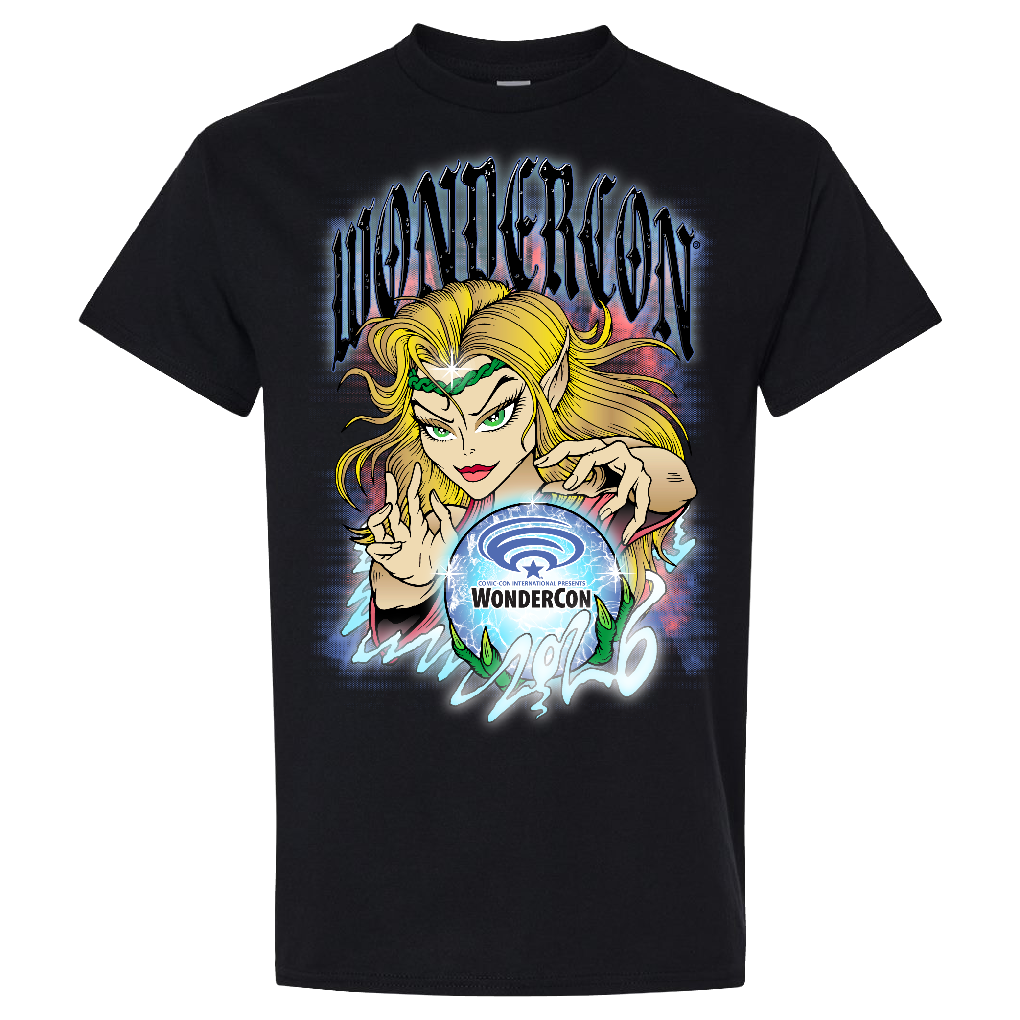 Channel pure convention-energy with a tee that looks like it burst straight out of an enchanted comic panel. Front and center is a fierce, spell-casting sorceress. Hair blazing, eyes glowing, and hands conjuring a swirling WonderCon emblem like it’s a portal to fandom greatness.